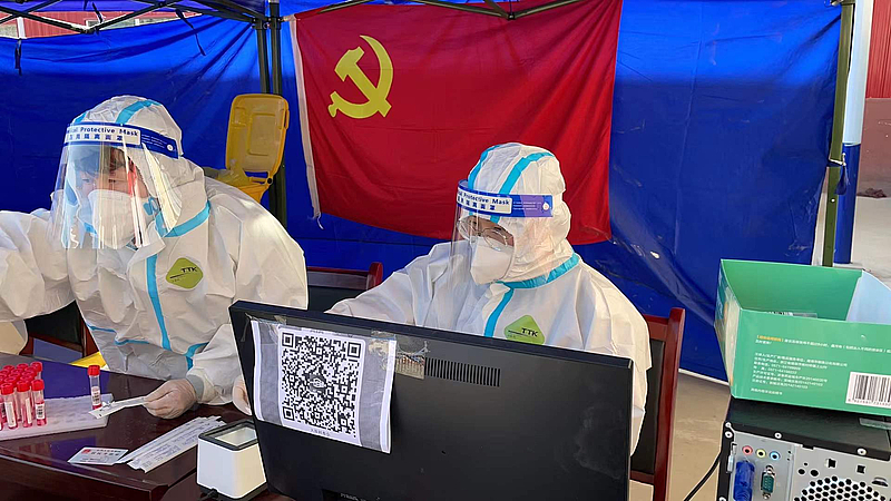 田薇娜協(xié)助醫(yī)務(wù)人員進(jìn)行核酸檢測工作
