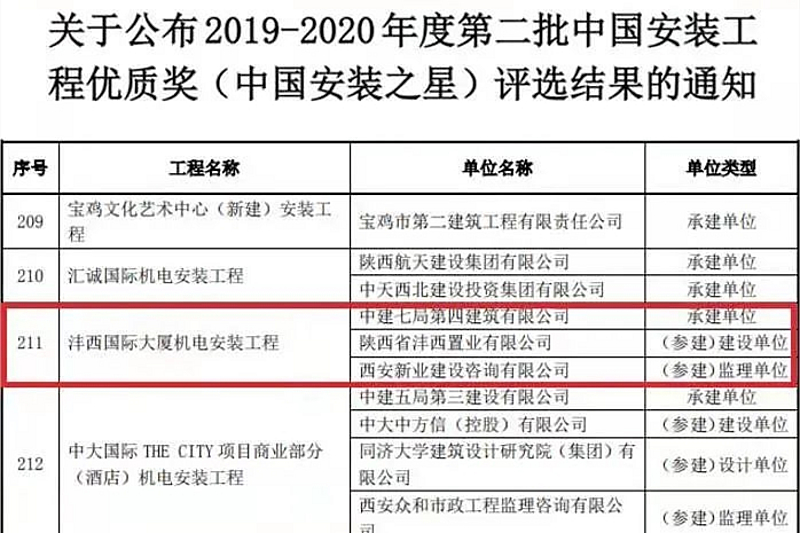 2020年,置業(yè)公司灃西國(guó)際大廈機(jī)電安裝工程項(xiàng)目榮獲中國(guó)安裝工程優(yōu)質(zhì)獎(jiǎng)(中國(guó)安裝之星)、總部經(jīng)濟(jì)園職工餐廳及5#樓內(nèi)部裝飾工程榮獲中國(guó)建筑工程裝飾獎(jiǎng)。