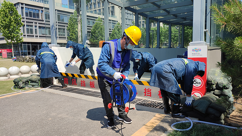 本次活動為灃西新城防汛救援演練的第三點(diǎn)位,現(xiàn)場模擬因較大雨情導(dǎo)致雨水倒灌云谷園區(qū)地下車庫后的應(yīng)急救援場景。整個演練過程緊張有序、組織嚴(yán)密、分工明確,參加演練人員快速響應(yīng)、對相關(guān)防汛器材操作熟練,展現(xiàn)了有序、高效、安全的防汛戰(zhàn)斗力。